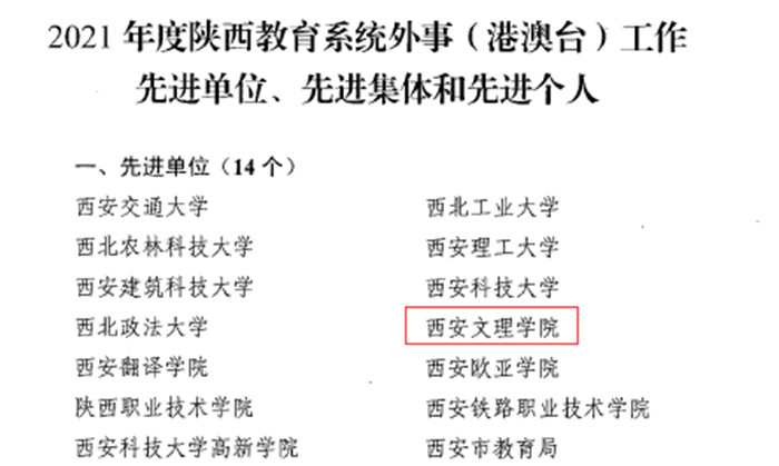 近日,省委教育工委、省教育厅下发《关于2021年度全省教育系统综合表彰的通报》(陕教工〔2022〕21号),西安九游老哥J9俱乐部官网学院荣获2021年度陕西省教育系统外事(港澳台)工作先进单位,国际交流处(港澳台事务办公室、国际教育...