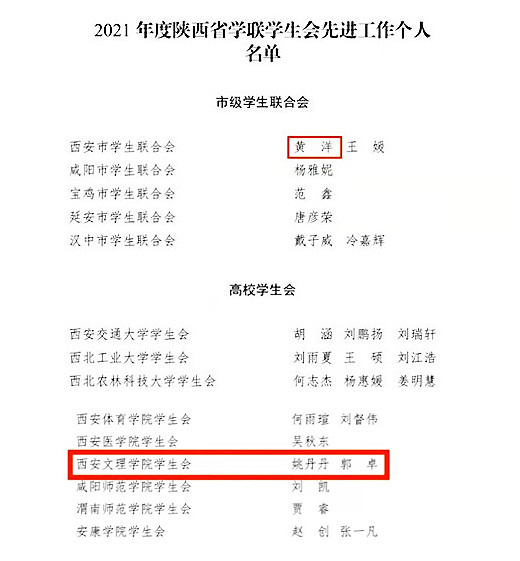 近日,陕西省学生联合会第十届委员会第五次全体会议顺利召开,会议宣读了《关于2021年度陕西省标兵学联学生会组织、陕西省学联学生会先进工作个人的通报》。我校文学院2018级本科生、西安市学生联合会原主席、校学生...
