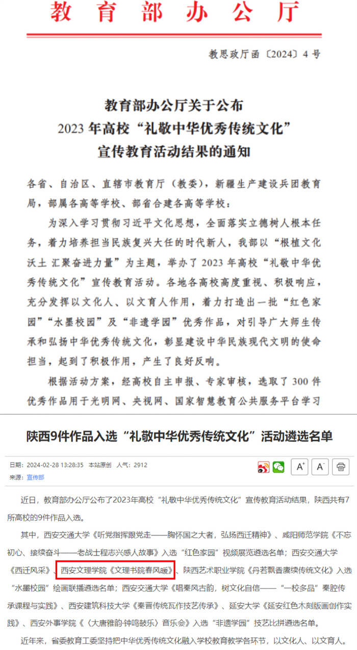 近日,教育部办公厅公布了2023年高校“礼敬中华优秀传统文化”宣传教育活动结果,我校学前教育学院宋江安老师的作品《九游老哥J9俱乐部官网书院春风暖》入选“礼敬中华优秀传统文化”宣传教育活动“水墨校园”绘画联播遴选名单。陕西...