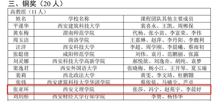 近日,首届全国大学生职业规划大赛陕西赛区大学生职业发展与就业指导课程教学赛道决赛落下帷幕,我校张亚环老师荣获高教组铜奖。 本次赛事是陕西省教育厅根据教育部统一部署,围绕落实立德树人根本任务、促进...
