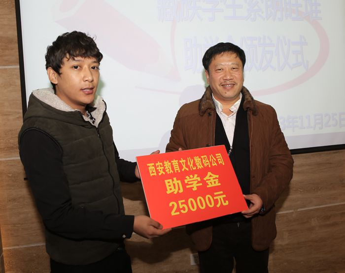 11月25日下午,西安教育文化数码公司帮扶藏族学生索朗旺堆助学金颁发仪式在明德楼负一层会议室举行。校党委书记张建国,纪委书记李军,西安教育文化数码公司董事长桂超、办公室主任赵劲出席助学金颁发仪式,宣传部、统...