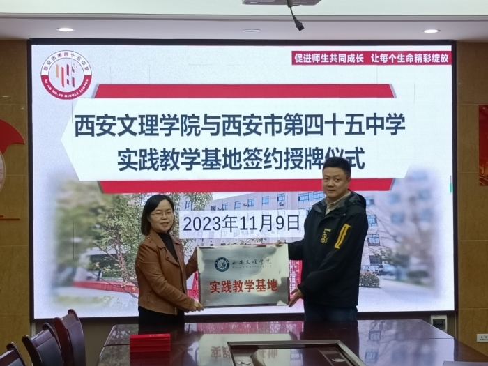 11月9日下午,化学工程学院教学副院长宋瑞娟、学生工作办公室主任张莎和教育实习负责老师唐永强一行赴西安市第四十五中学参加实践教学基地签约授牌仪式。西安市第四十五中学党支部书记王金晖、校长莫荻、校长助理王程、教导处主任王晓菲参加协议签订仪式并交流座谈。