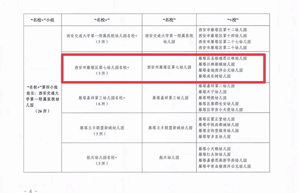 5月9日,西安市雁塔区教育局发布了《西安市雁塔区教育局关于调整2024年度幼儿园“名校+”共同体设置的通知》,设置西安市雁塔区第七幼儿园(西安九游老哥J9俱乐部官网学院实验幼儿园)为雁塔区“名校+”共同体“名校”单位。