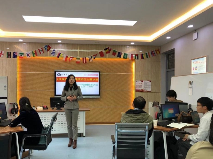 本次研讨会由浙江卫视英语新闻编译杨彬老师主讲,内容围绕《发现西安》翻译项目主题,包括新闻英语语言特征、新闻英语标题及正文翻译方法、汉译英特点以及字幕翻译特点等方面。通过讲座及会后座谈,杨老师系统解答了项目组在翻译过程中常见的问题,并指出今后新闻翻译实践中应注意的事项。同学们积极与杨老师交流互动,现场氛围热烈而轻松。