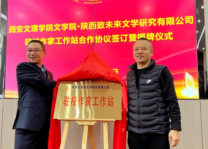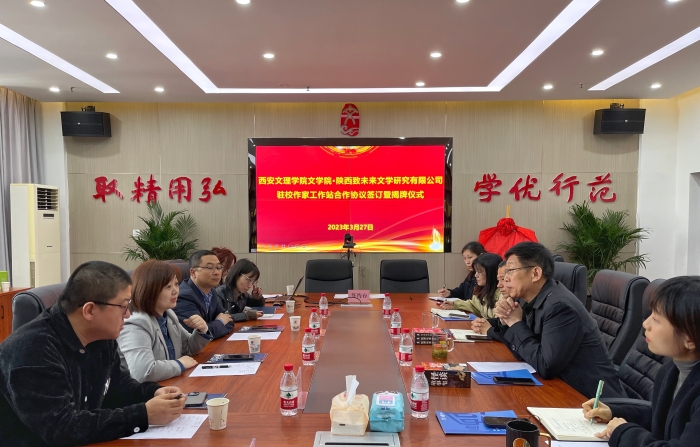 3月27日上午,文学院与陕西致未来文学研究有限公司驻校作家工作站签约暨挂牌仪式在明德楼举行。文学院院长郝延军,党总支书记吴勃,副院长马娜,创意写作工坊教师王亚惠、学生代表;西部国家版权交易中心总经理、陕西致未来文学研究有限公司董事长王艺霖,总经理助理白亮,副总经理杨雯等参加。马娜主持仪式。