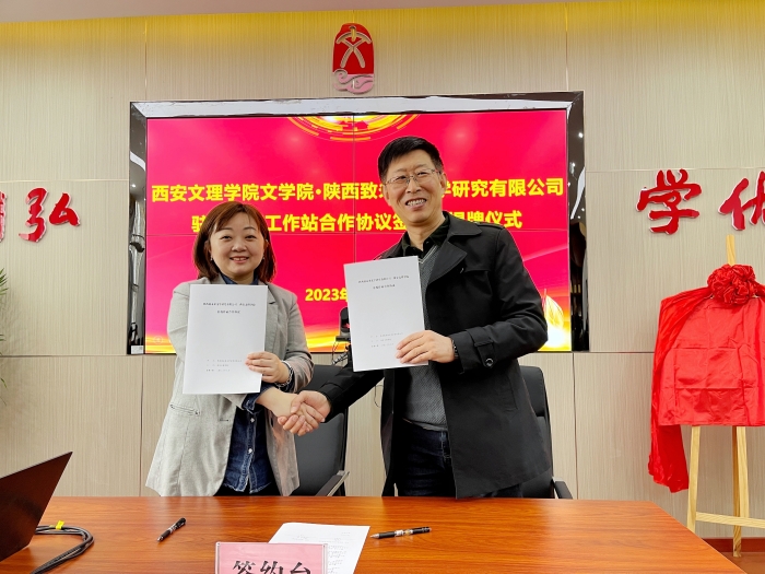 参会双方进行签约暨挂牌仪式,郝延军与王艺霖共同签定了合作协议,吴勃与白亮共同揭牌。此次驻校作家工作站的成立进一步促进了文学院与西安地方企业进行产学研合作,今后双方在合作中共同孵化学生成果,推动地方文化产业发展。