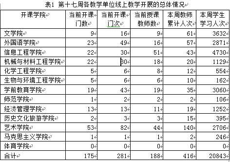 自2月24日以来,我校2020年春季学期线上教学已开展十七周。在校党委正确领导和广大师生共同努力下,新学期线上教学工作总体上运行平稳、有序进行。现将第十七周的线上教学运行情况汇总如下: