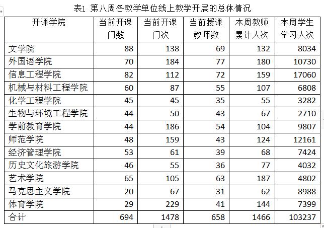 自2月24日以来,我校2020年春季学期线上教学已开展八周。在校党委正确领导和广大师生共同努力下,新学期线上教学工作总体上运行平稳、有序进行。现将第八周的线上教学运行情况总结如下: