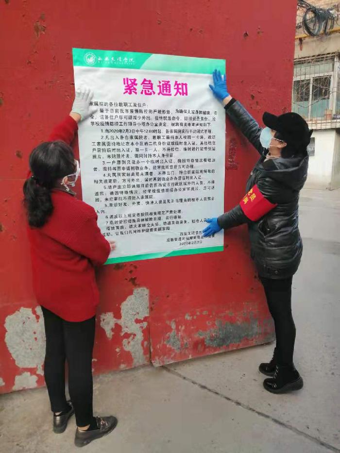 后勤管理与保障处切实扛起疫情防控的重任,按照分工明确、责任到人、科学防治、精准施策的原则,切实做到守土有责、守土尽责,坚决打赢疫情防控阻击战。一是切实做好饮食安全及物资保障工作。饮食中心严格落实工作人员晨检、上岗洗手消毒和食堂消毒工作,加强每日体温测量与接触人员情况了解,做好消毒记录。每天对后厨、就餐区实行两次消毒,工作人员全部佩戴口罩和一次性手套,一餐一换,避免二次污染。对进入食堂的就餐师生进行一一登记,测量体温,如有异常立即上报。设立提示牌,提醒就餐人员佩戴口罩,并免费提供洗手液、消毒液等。米面粮油、果蔬副食等生活商品储备充足,满足师生需求,对自行在家隔离住户及生活出行不便教职工提供蔬菜等生活用品的代购服务。二是保障水电气暖供应。动力中心人员24小时值守,保障锅炉房、二次供水、热交换站、高低压配电室正常运行,确保用水安全。三是加强校园管理,落实日常消毒。对高新校区人员留守区域进行每天2次消毒,在南门口对所有进入校园车辆进行消毒,对留守的临聘人员加强疫情防控教育,加强自我保护。四是加强对5个家属区的管理。调集各方力量抓紧购置防护口罩及消毒器具和药品,定时按量喷洒,暂时关闭球馆及活动室等公共场所;严禁外来车辆和外人员进入,实行单门24值守登记制度,并临时关闭太白校区中门;对小区系统内进出车辆进行消毒,对进入小区的教职工进行体温测试,发现异常后第一时间联系所属街办并做好配合工作。在家属区设置废弃口罩投放箱,禁止随意扔弃,阻断病毒传播源。