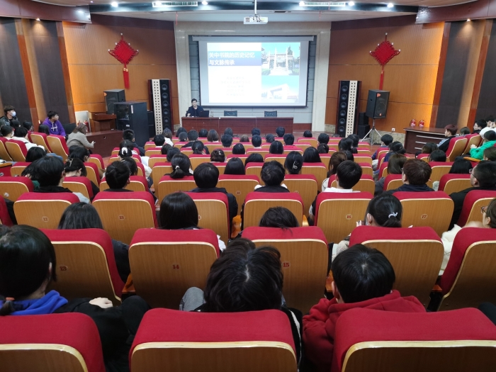 为促进2022级学生深入了解学校历史发展脉络和关学文化根基,增强知校爱校情怀,提升文化育人成效,3月2日晚,历史文化旅游学院在图书馆报告厅举行“校史校情”专题教育。院长张天社教授作了题为《关中书院的历史记忆与文脉传承》报告,学院教师代表、辅导员、22级学生200余人参加,会议由赵媛老师主持。