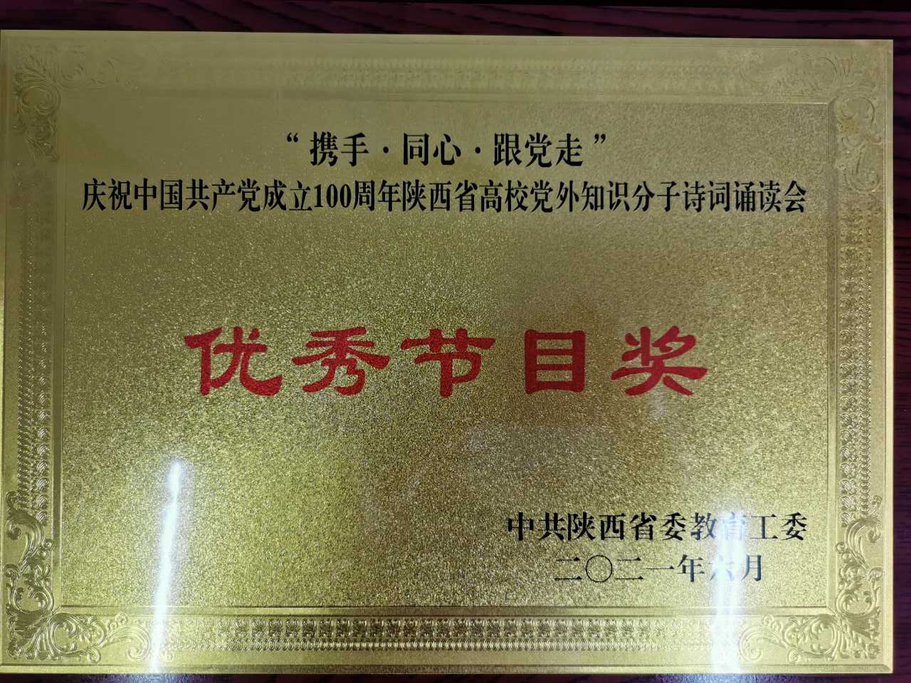 6月27日,省委教育工委组织“携手、同心、跟党走”庆祝中国共产党成立100周年陕西省高校党外知识分子诗词诵读会,我校党委统战部推荐,我校统战成员表演的诗朗诵《歌唱伟大的中国共产党》获得“优秀节目奖”。参加演出的有民进主委杨艺媛、民进会员王翊、留学归国教师王晨、雷昊霖、少数民族教师马文龙。