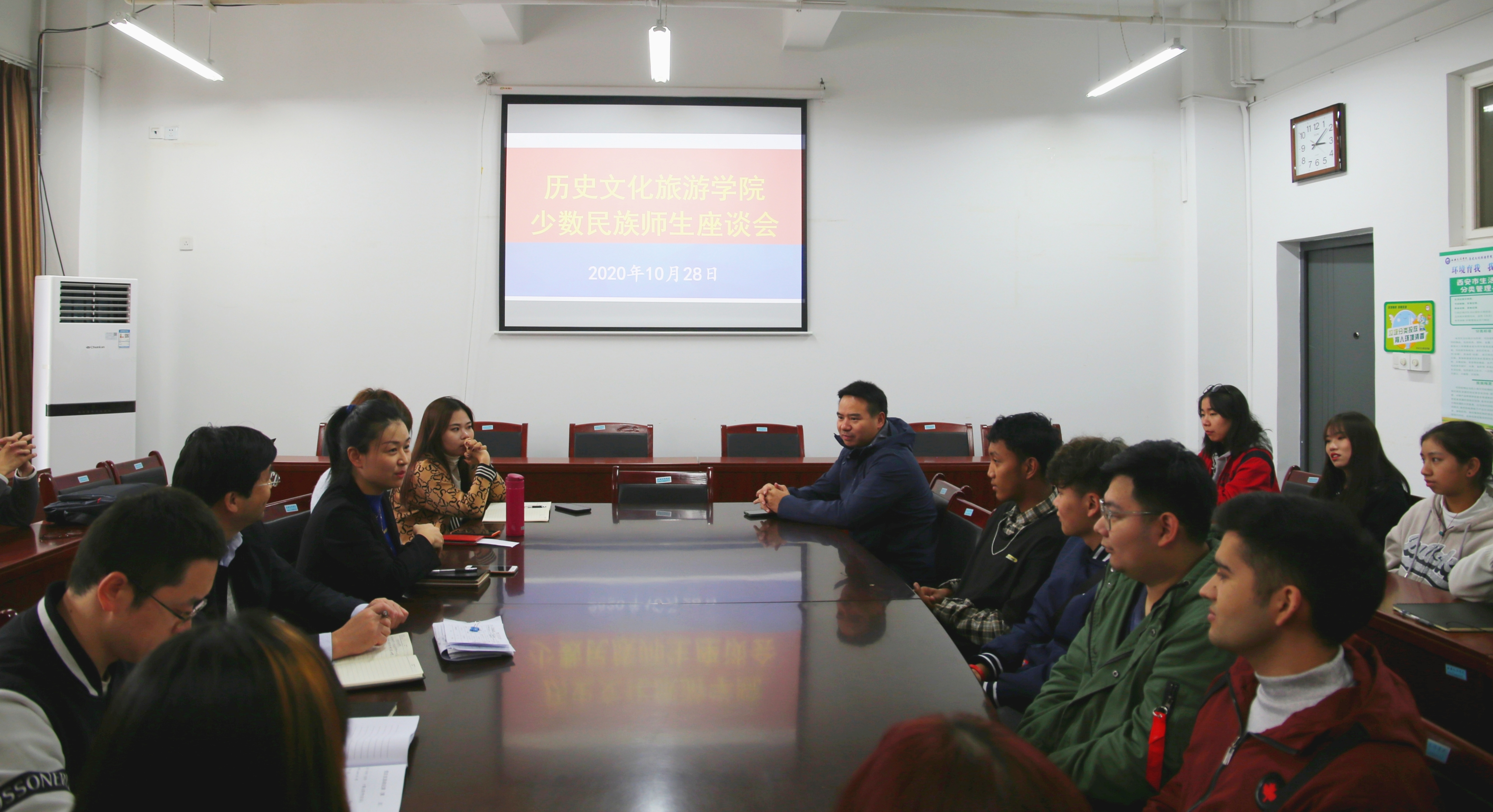 10月28日下午,历史文化旅游学院召开少数民族师生座谈会。院长张天社,少数民族教师代表姚媛副教授,统战委员胡明,辅导员赵荣,秘书万可蒙、张未娜及来自藏族、维吾尔族、回族、壮族、满族、苗族、黎族、朝鲜族、蒙古族、土家族、布依族等少数民族的学生代表参加座谈会,座谈由党总支副书记刘倩倩主持。