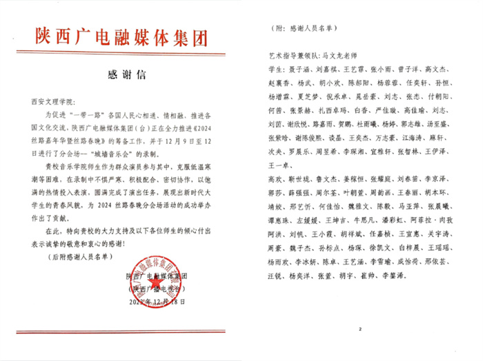 近日,音乐学院收到陕西广电融媒体集团感谢信,对我院组织师生参与2024丝路春晚活动表示感谢。