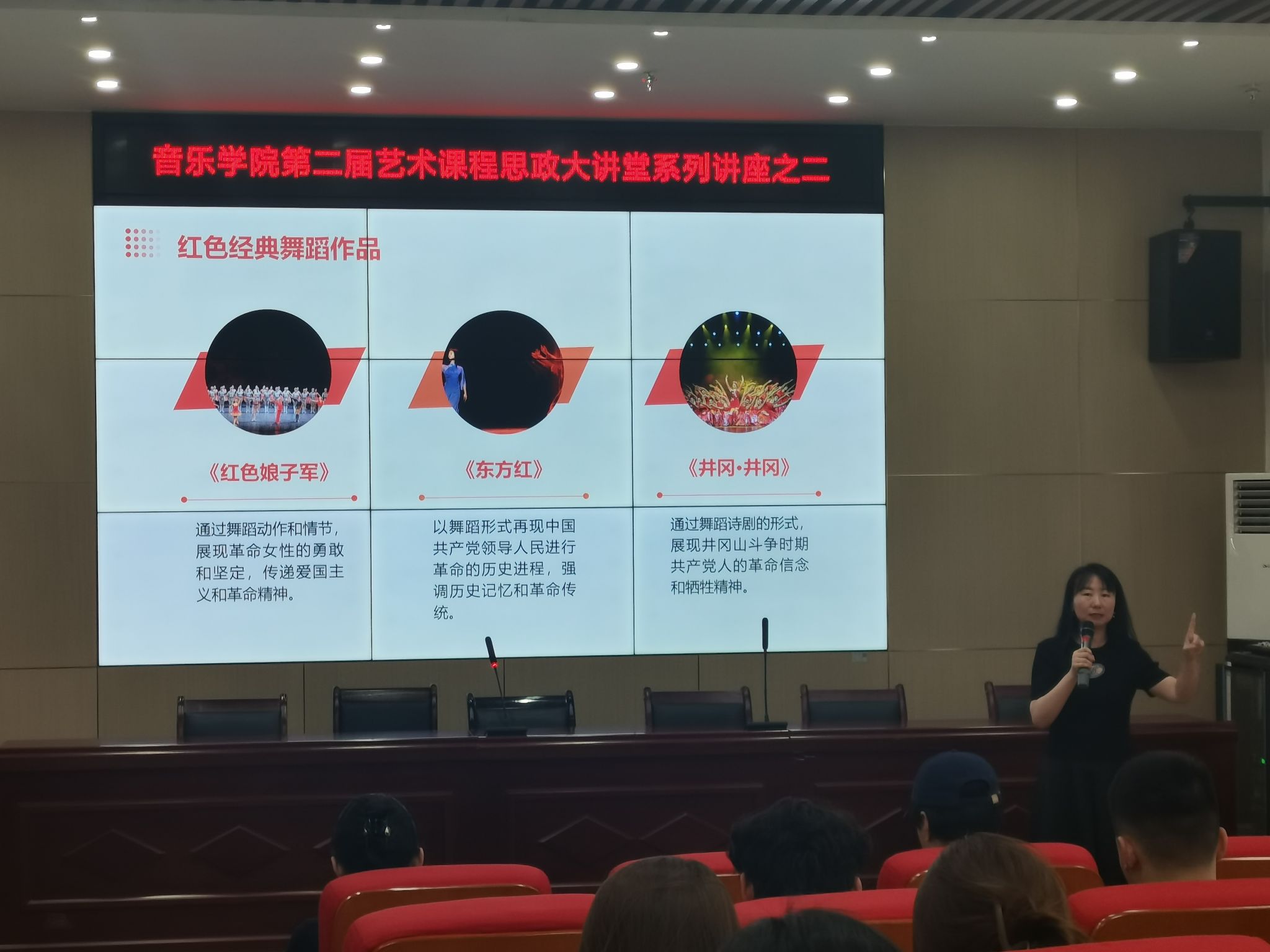 6月5日下午,音乐学院在明德楼C103报告厅举办桑田副教授主讲的第二届课程思政大讲堂系列讲座之二《舞蹈中的红色的信念——舞蹈艺术与思政教育的实践融合》,讲座由党总支委员高婧主持,学院领导、教师代表、学生党员参加讲座。