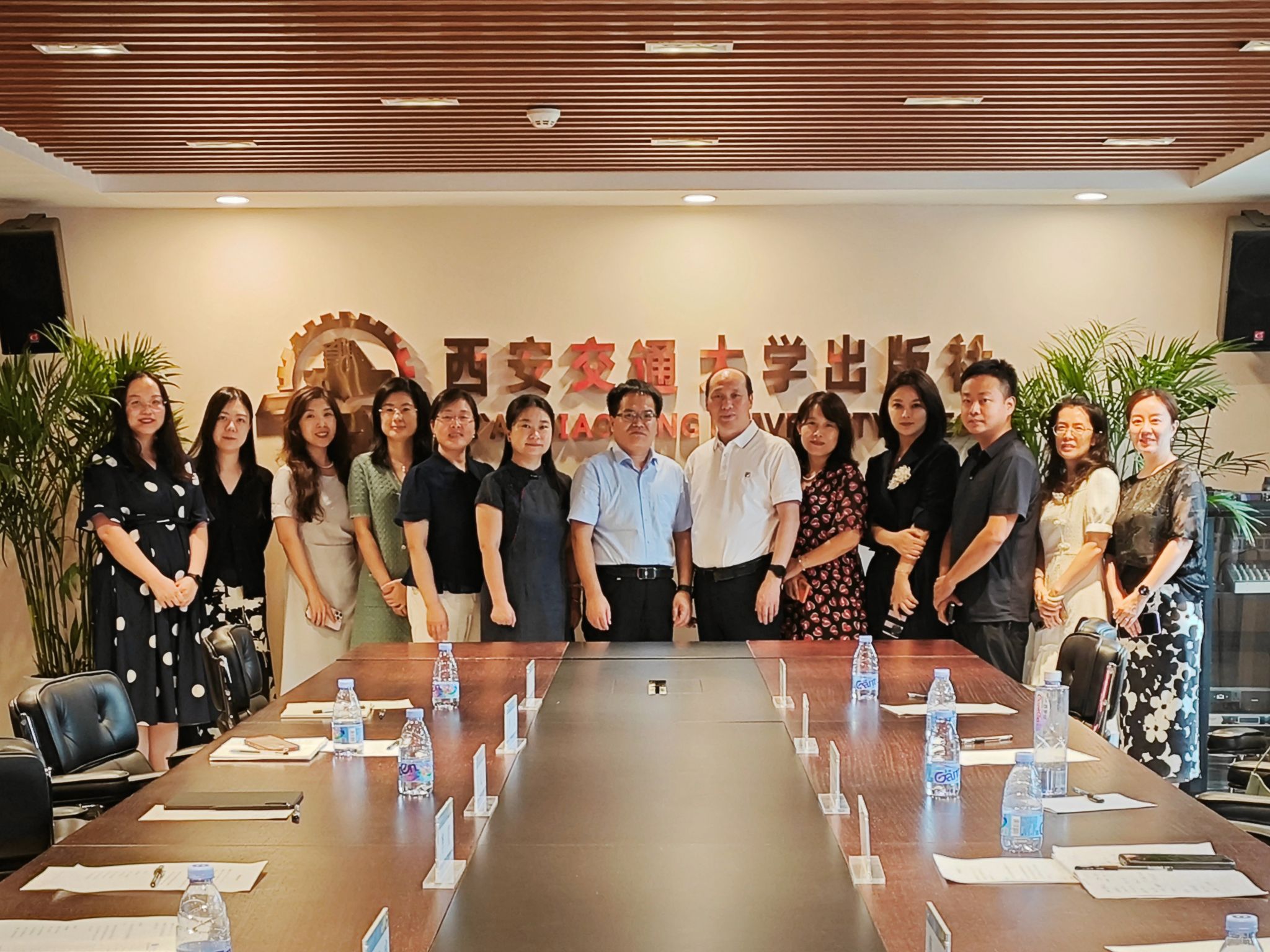 7月24日,为进一步推动翻译硕士和应用心理学两个硕士学位授予点的申硕工作,巩固申硕成果,助力学科专业建设,外国语学院院长韩红建、师范学院院长曹莹率申硕团队相关成员赴西安交通大学出版社调研交流。西安交通大学出版社社长李重、副总编辑秦茂盛、西安九游老哥J9俱乐部官网学院外国语学院科研副院长邹维、师范学院教学副院长李晶、西安交通大学出版社人文分社主任王斌会及编辑部成员参加本次调研。