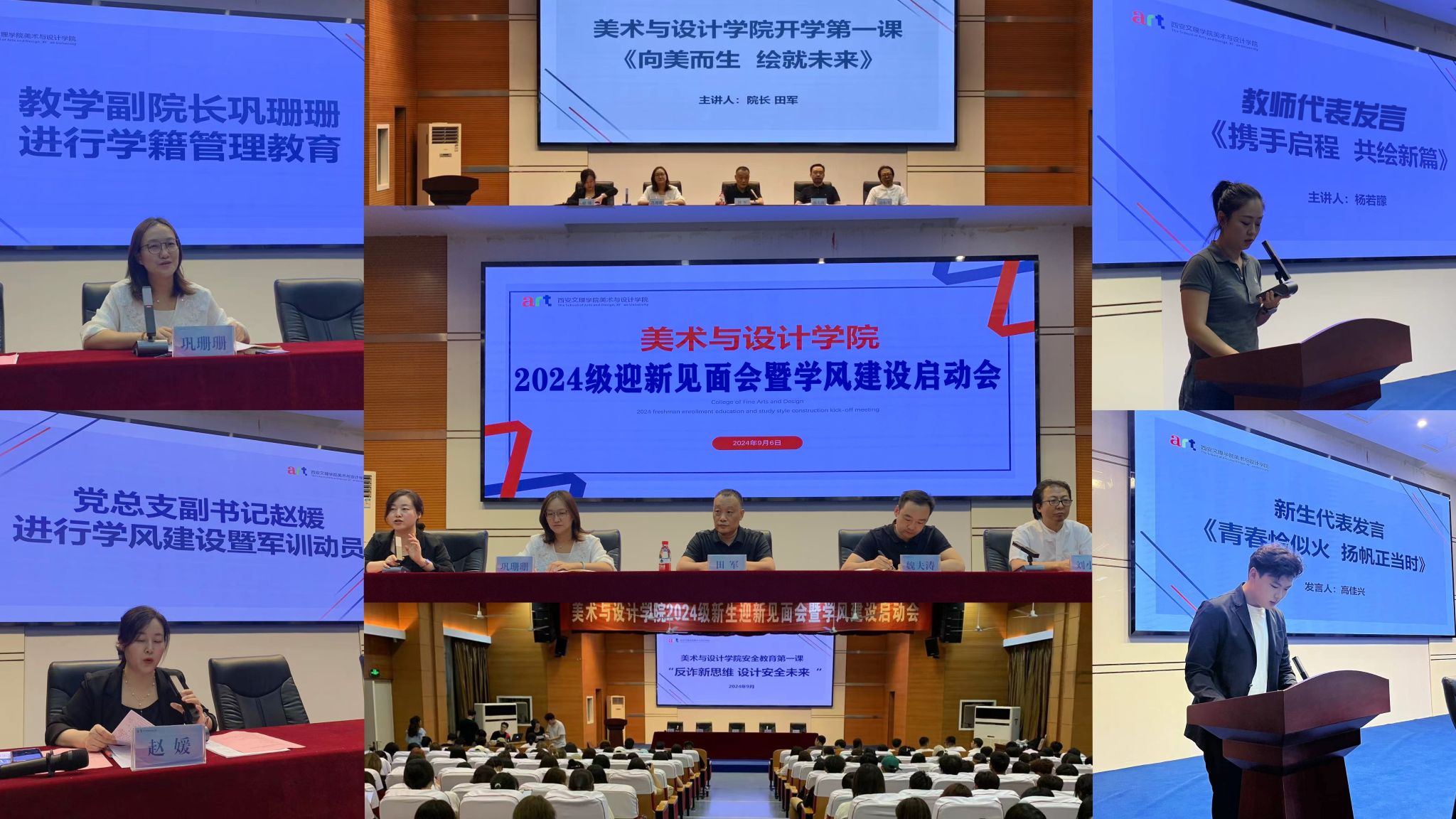 9 月 6 日下午,美术与设计学院在明德楼 A 区报告厅召开 2024 级新生迎新见面会暨本学年学风建设启动会。学院领导班子、各系部主任、党政办、教学办、学工办全体老师、 242 名 2024 级新生以及各年级学生干部参加。会议由党总支副书记赵媛主持。