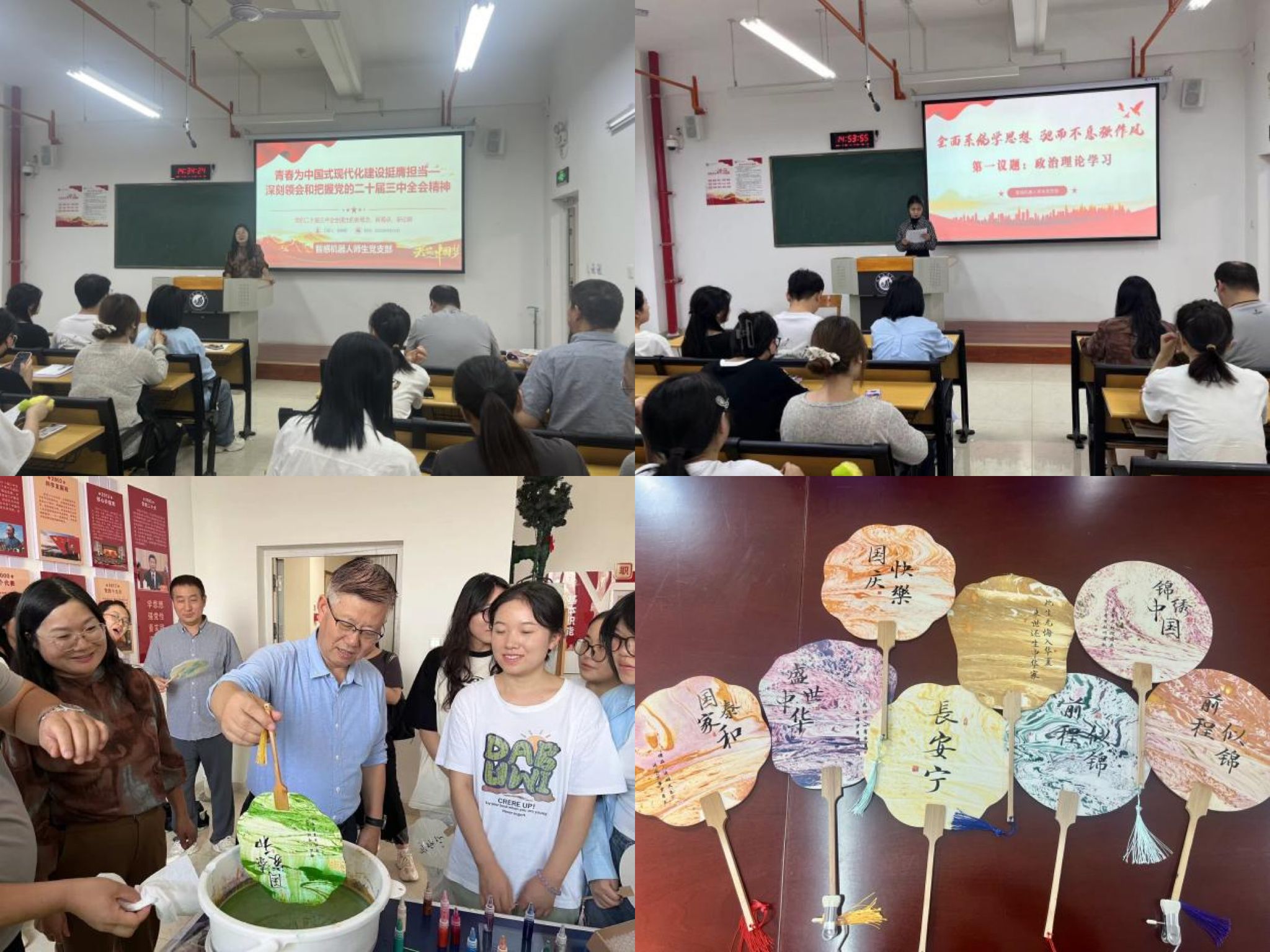 为迎庆中华人民共和国成立 75 周年,机械与材料工程学院智感机器人师生党支部组织开展“丹漆纷染迎国庆,不忘初心继前行”非遗漆扇渲染主题党日活动,掀起一场“红色研学”热潮。这次主题党日活动紧扣抓思想学理论、树典范立先锋、绘漆扇献祝福三大内容开展。