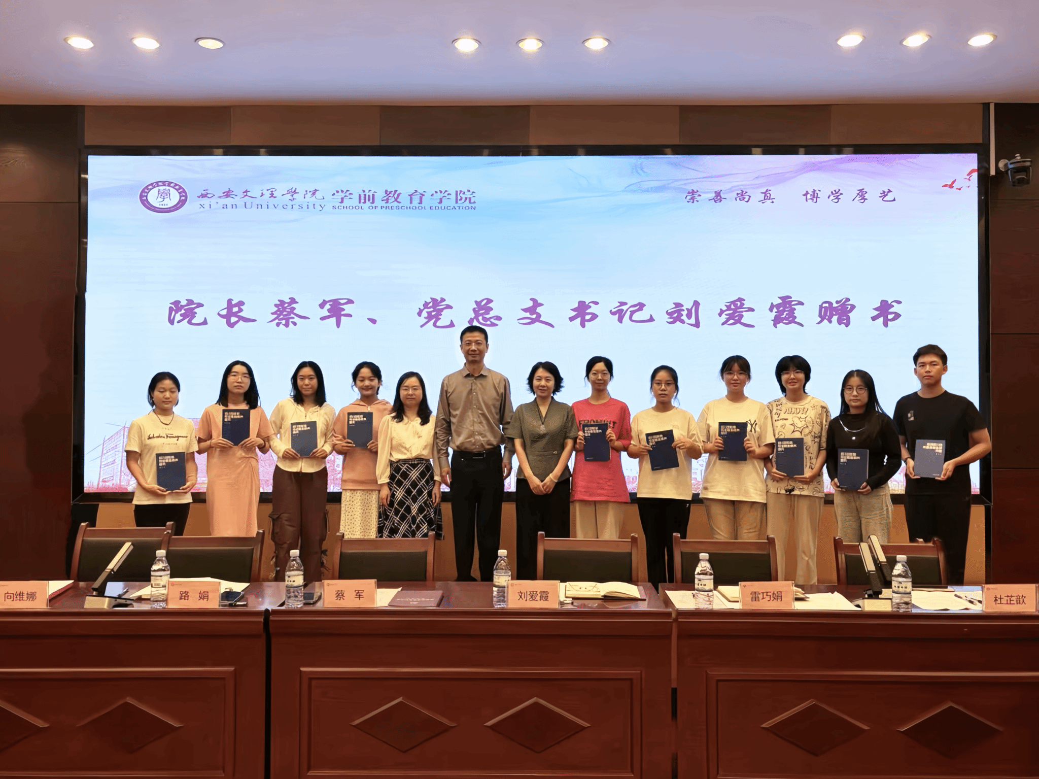 接下来进入到温馨庄重的赠书环节。院长蔡军、党总支书记刘爱霞、副院长路娟为2024级创新实验班学生赠书。院长将自己的著作《幼儿园教师专业核心素养研究》赠予同学们,勉励大家坚定理想信念,勤于探索学习,勇攀专业高峰。
