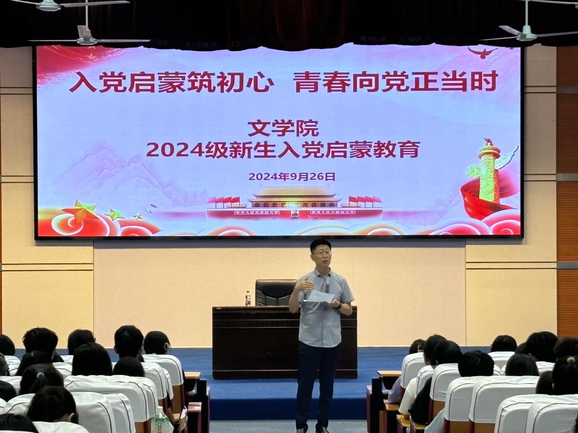 为进一步践行为党育人、为国育才的教育使命,坚定学生理想信念,加深学生对党的认识,引导学生树立正确的世界观、人生观、价值观,9月26日,文学院在明德楼A区报告厅举行2024级新生入党启蒙教育活动。讲座由学生党支部书记张琳主持,文学院院长郝延军主讲。