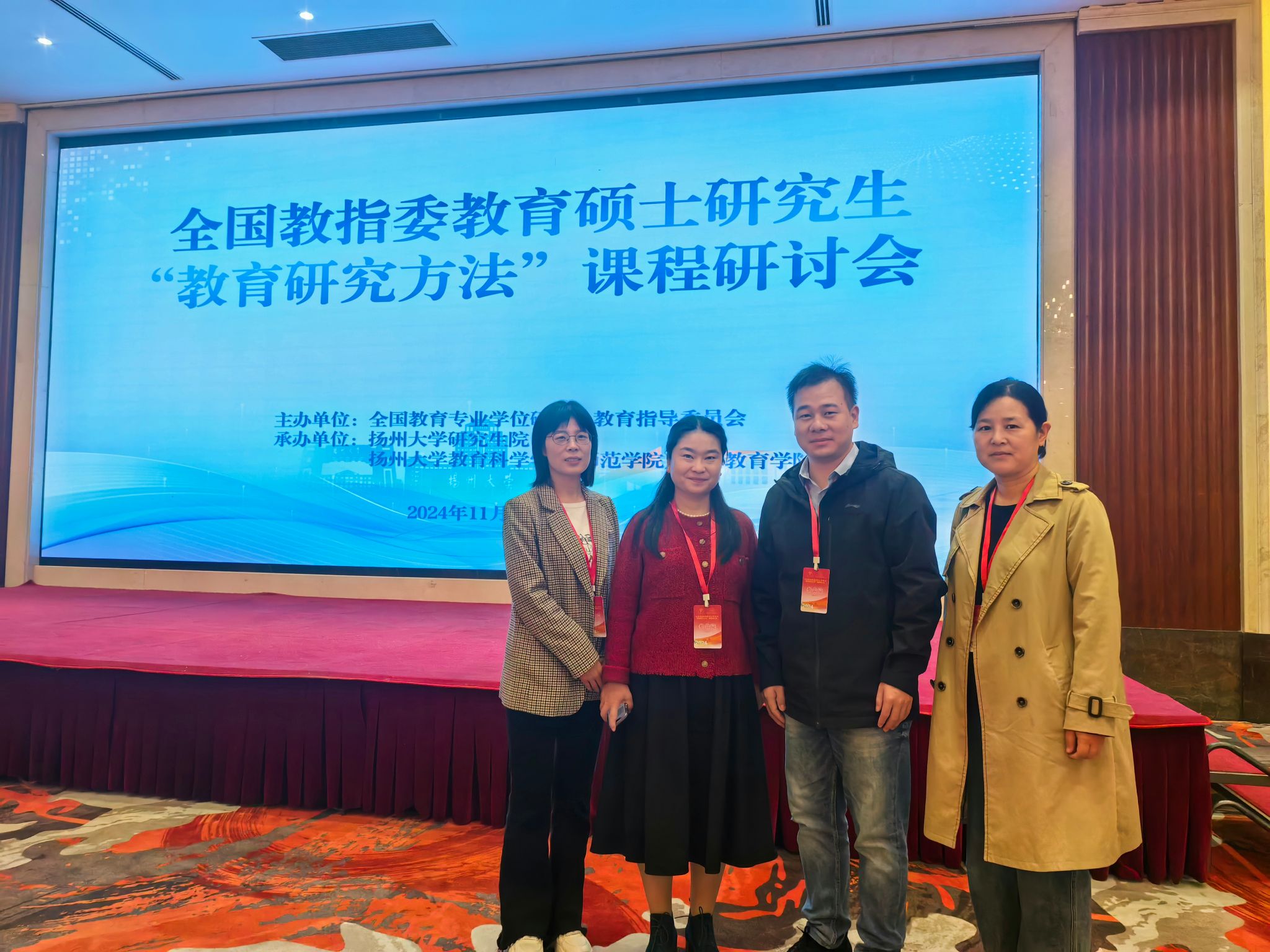 11月8日至10日,全国教育专业学位研究生教育指导委员会教育硕士研究生“教育研究方法”课程研讨会在扬州大学召开。我校教育硕士团队负责人、师范学院院长曹莹带队,小学教育和学前教育领域教师代表耿飞飞、禄晓平、张少华一行四人前往参会。