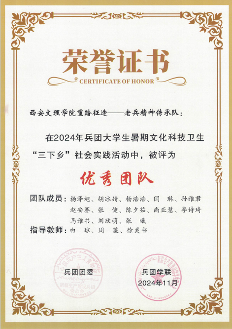 近日,我校重踏征途——老兵精神传承队在2024年全国大学生暑期文化科技卫生“三下乡”社会实践活动兵团专项活动中获评“优秀团队”称号。