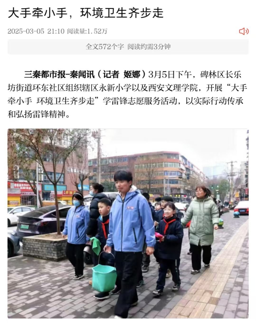 3月3日—7日,学前教育学院联合高新区丈八街道甘家寨社区、碑林区长乐坊街道环东社区、碑林区永新小学,共同举办“大手拉小手,环境卫生齐步走”学雷锋志愿服务活动。活动被《华商报》《三秦都市报》等多家主流媒体相继报道,展现了我校学生践行雷锋精神、服务社会的责任担当。