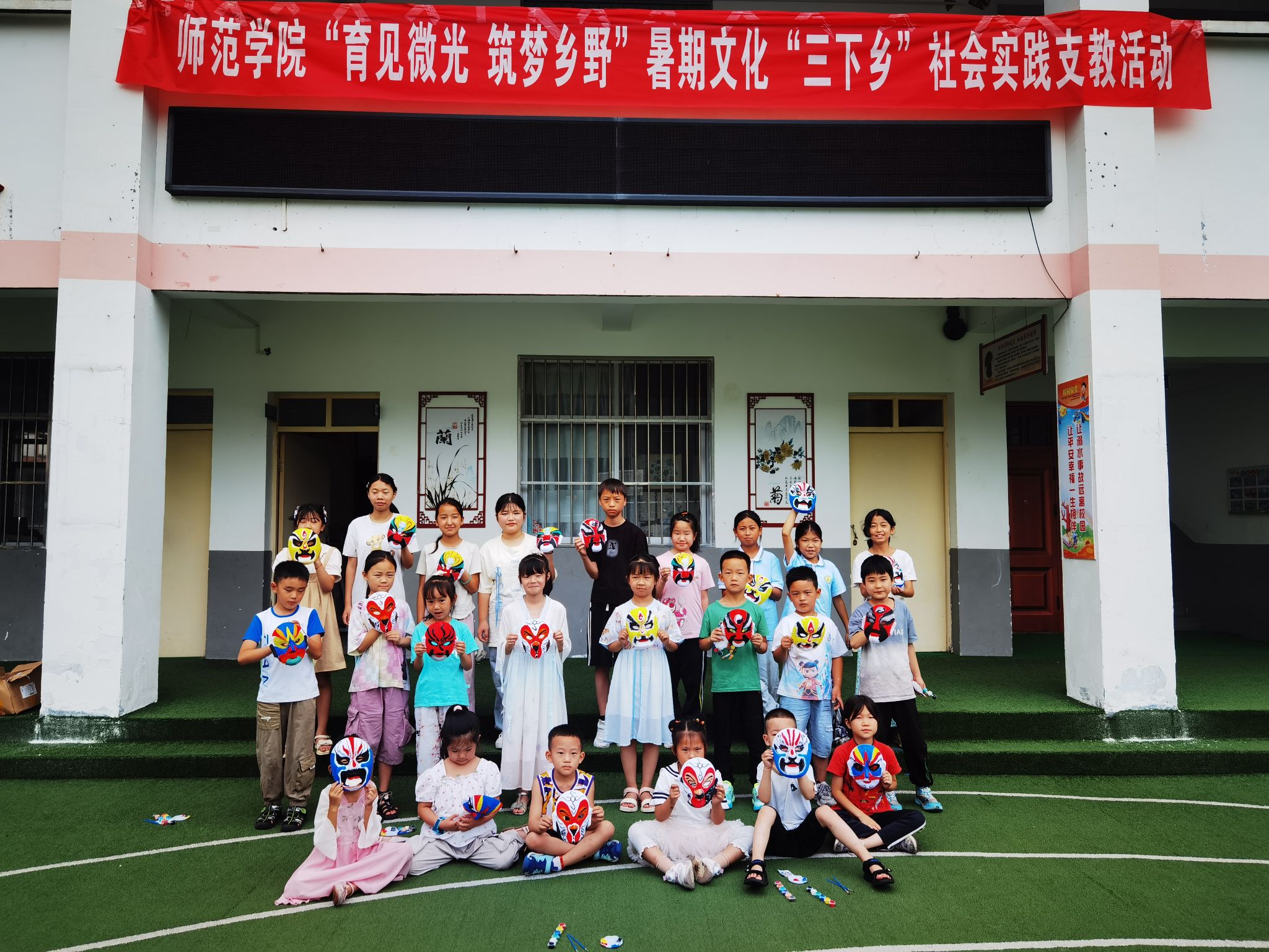 近日,我校师范学院大学生支教团队一行10人,赴宁陕县龙王镇铁炉小学开展美育支教活动。支教期间,志愿者们结合师范专业特长,精心设计了一系列符合乡村小学生认知特点的美育课程。音乐课堂上,孩子们在志愿者的带领下学唱童谣;书法课上,志愿者们耐心指导,孩子们一笔一划临摹,感受汉字的方正之美;美术与手工课则成了孩子们发挥想象力的天地,他们用画笔描绘家乡风光,用彩纸、团扇、脸谱等制作出充满童趣的手工作品。