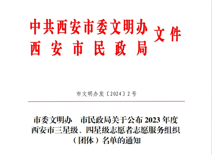 近日,中共西安市委文明办、西安市民政局对2023年度西安市三星级、四星级志愿者志愿服务组织(团体)名单进行了公示。我校青年志愿者协会荣获三星级志愿者志愿服务组织。这一成果彰显了我校在积极培育和践行社会主义核心价值观方面的坚定决心,以及广泛动员学生参与志愿服务活动的显著成效。