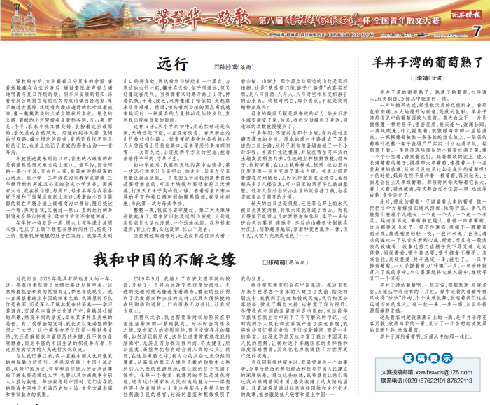 为了反映“一带一路”倡议的新进展、新成效,用文学讴歌“新丝路”,西安报业传媒集团(西安日报社)举办了主题为“一带繁华一路歌”的全国青年散文大赛征文活动。我校尼泊尔籍留学生张萌萌的文章《我和中国的不解之缘》在众多投稿中脱颖而出,于10月23日在《西安晚报》“一带一路”征文专版刊发。张萌萌成为首个正式在《西安晚报》刊发作品的外籍作者。