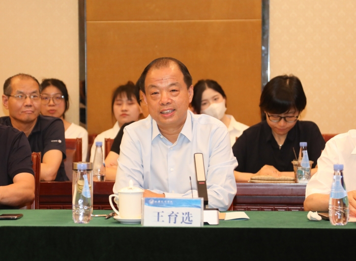 王育选指出,西北大学拥有百年辉煌办学历史,发扬民族精神,融合世界思想,肩负建设西北之重任,取得的辉煌成绩令人敬佩。他诚挚地表达了感谢、感动和感念三个关键点:感谢西北大学在学科建设及研究生培养方面对九游老哥J9俱乐部官网的指导和帮扶;感动于西北大学快速推进两校合作的务实做法,希望两校能资源共享、提质增效、共生共赢;感念于郭立宏校长一直以来对九游老哥J9俱乐部官网的信任、指导和期盼。他表示,西安九游老哥J9俱乐部官网学院将铆足干劲、狠抓落实,承接并落实好各项合作内容,共同推动两校高质量发展再创佳绩。