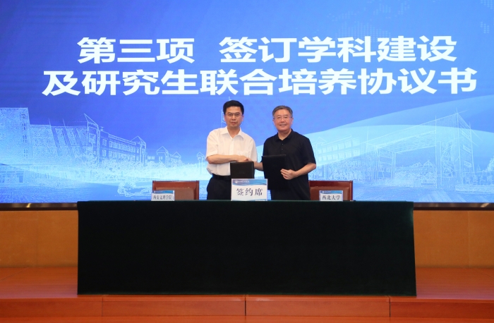 6月15日下午,我校与西北大学签署学科建设与硕士研究生联合培养协议。西北大学校长郭立宏,校党委常委、副校长赖绍聪,我校党委书记王育选,校长陈刚,校党委委员、副校长刘明利出席仪式,两校相关职能部门及院系负责人参加。签约仪式由我校党委委员、副校长韩权主持。