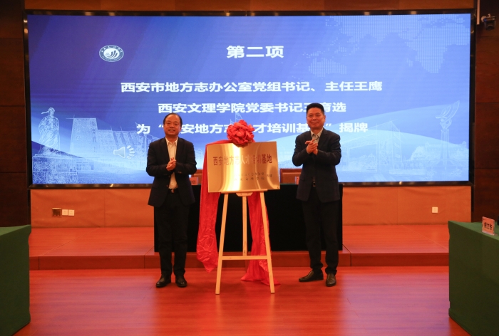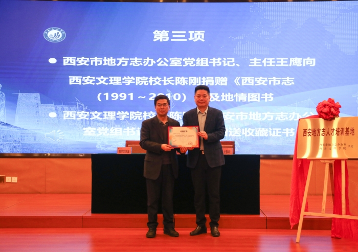 签约仪式上,韩权、崔义萍代表双方签订了战略合作协议。王育选,王鹰为“西安地方志人才培训基地”揭牌。随后,王鹰向我校捐赠《西安市志(1991~2010)》及地情图书;陈刚向市地方志办赠送收藏证书。
