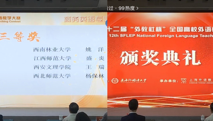 本次大赛于2021年5月份正式启动,经过层层选拔、多轮评审,我校英语系教师王瑞获陕西赛区商务英语组特等奖,并最终代表陕西省参加在上海举行的全国总决赛,实现了我校外语教师在该项赛事中获奖级别的历史性突破。全国总决赛采用选手在线授课、评委线上线下评审的形式。大赛在网络同步直播,吸引了近30万人次在线观看。