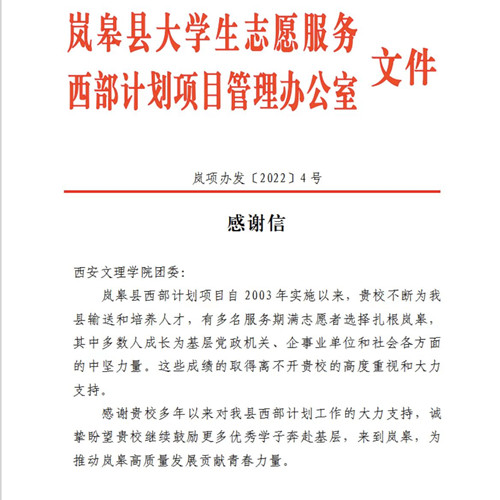 大学生志愿服务西部计划岚皋县项目办向我校发来感谢信