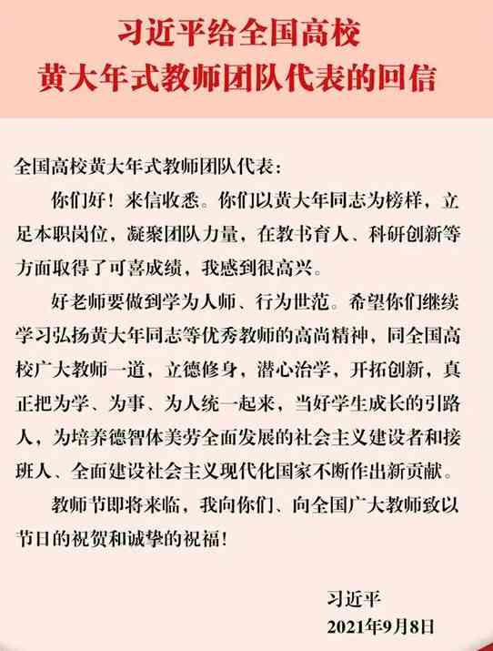 9月8日,中共中央总书记、国家主席、中央军委主席习近平给全国高校黄大年式教师团队代表回信,对他们寄予殷切期望,并向全国广大教师致以节日的祝贺和诚挚的祝福。