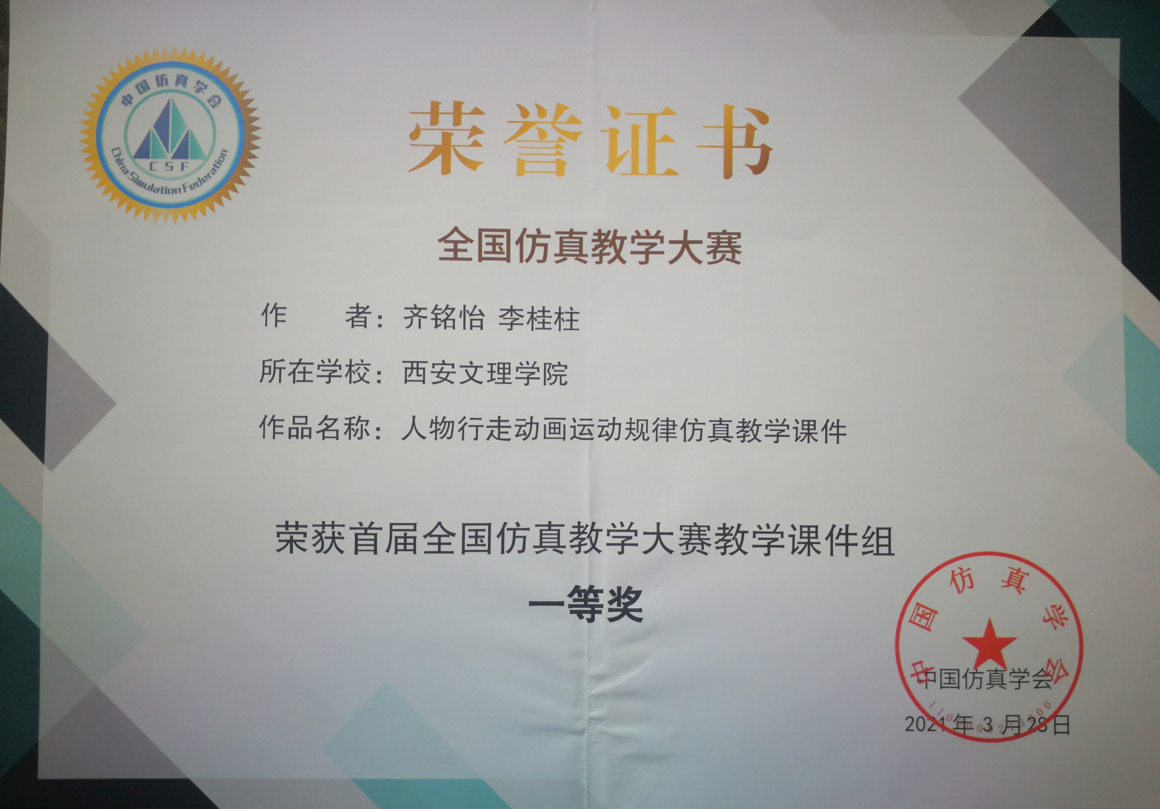 3月26至3月28日,由中国仿真学会主办的"首届全国仿真教学大赛"在北京隆重举行,我校艺术学院数字媒体艺术系青年教师齐铭怡参赛的《人物行走动画运动规律仿真教学课件》荣获仿真教学课件组大赛"一等奖"。