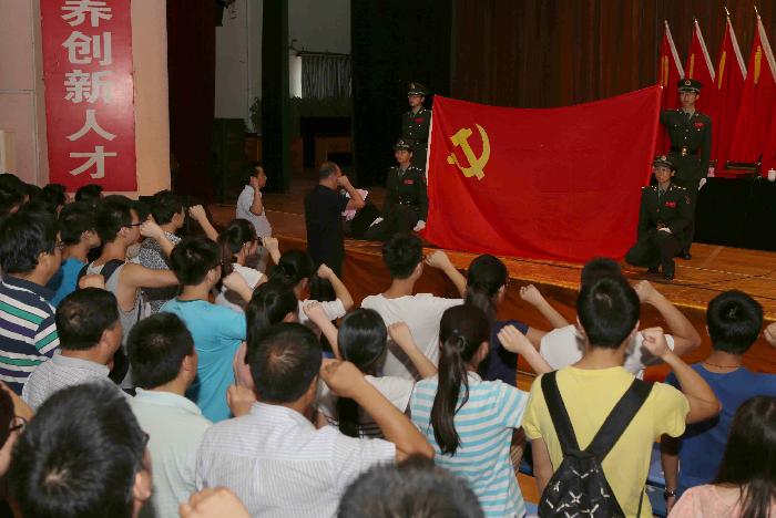 大会首先进行了入党宣誓。新党员在党旗面前庄严宣誓,老党员重温入党誓词。