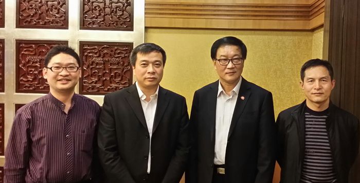 校长徐可为与许挺(左一)、康震(左二)、窦尔翔(右一)合影