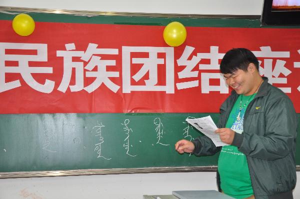 座谈会上,各位少数民族学生将自己民族的风俗习惯和传统文化与大家进行了交流,满族学生代表王鑫还特意向大家展示了自己书写的满文,回族学生李珂欣与大家分享了自己作为回族学生的所见所闻和风趣小事,布依族学生许骞给大家述说了自己民族的民族特色,让大家进一步了解了各民族不同的文化氛围和风俗习惯。与会的各位领导还为少数民族学生分别发放了形式多样的小礼物,希望大家学习进步,爱家爱校,共享和谐。