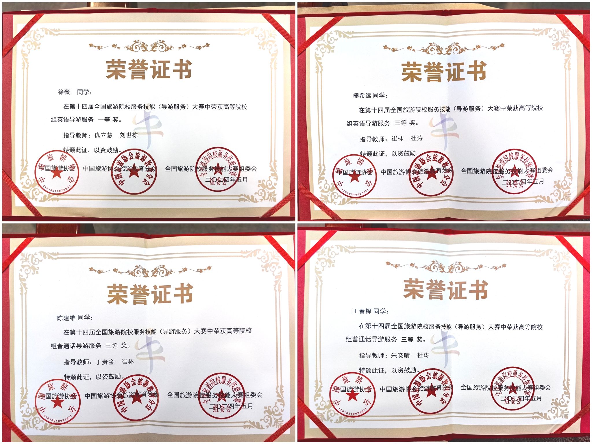 历史文化旅游学院高度重视本次大赛,2024年3月遴选了4名优秀学生积极备赛,由崔林、朱晓晴、仇立慧、刘世栋、丁贵金、杜涛6位教师和校外行业专家组成导师组,采用集中指导和分散指导的方式集中训练备赛。在比赛中,选手们全力以赴参赛,展现了我校学生良好的专业素质和精神面貌,并取得了优异成绩:旅游管理专升本2302班徐薇同学获得英语导游服务一等奖,旅游管理2102班熊希运同学获得英语导游服务三等奖,旅游管理2102班陈建维和王春铎同学分别获得普通话导游服务三等奖。