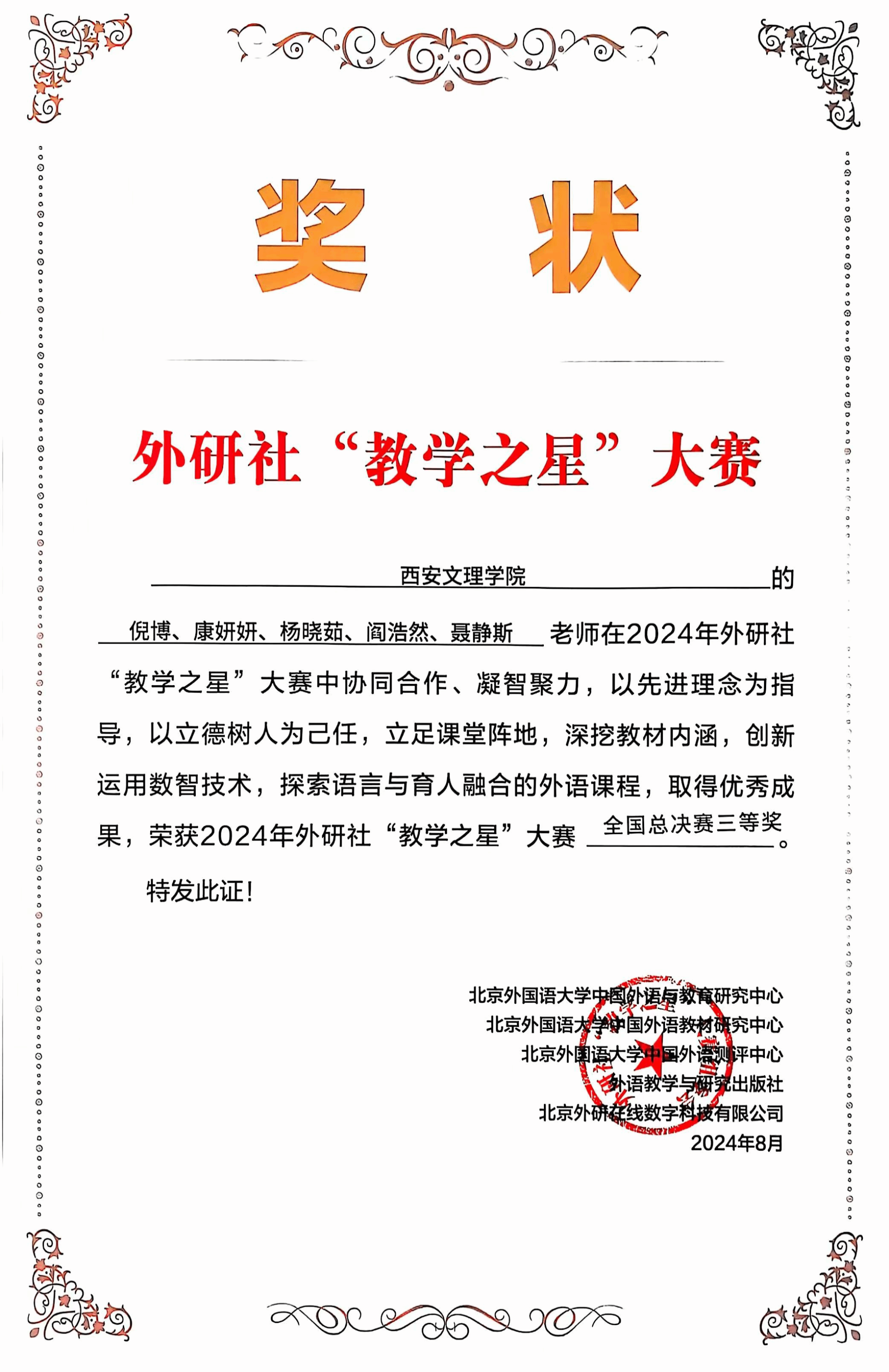 7月15日-8月5日,2024年外研社“教学之星”大赛全国半决赛于太原、合肥两地举办。我校外国语学院教师团队凭借新颖的教学理念,精湛的教学设计和精彩的教学展示,在全国复赛中荣获特等奖,并作为陕西省唯一的英语专业教学团队,成功晋级全国半决赛。在全国半决赛中,共有96组参赛教师团队,我校教师团队在众多参赛队伍中脱颖而出,最终荣获英语专业组全国总决赛三等奖。