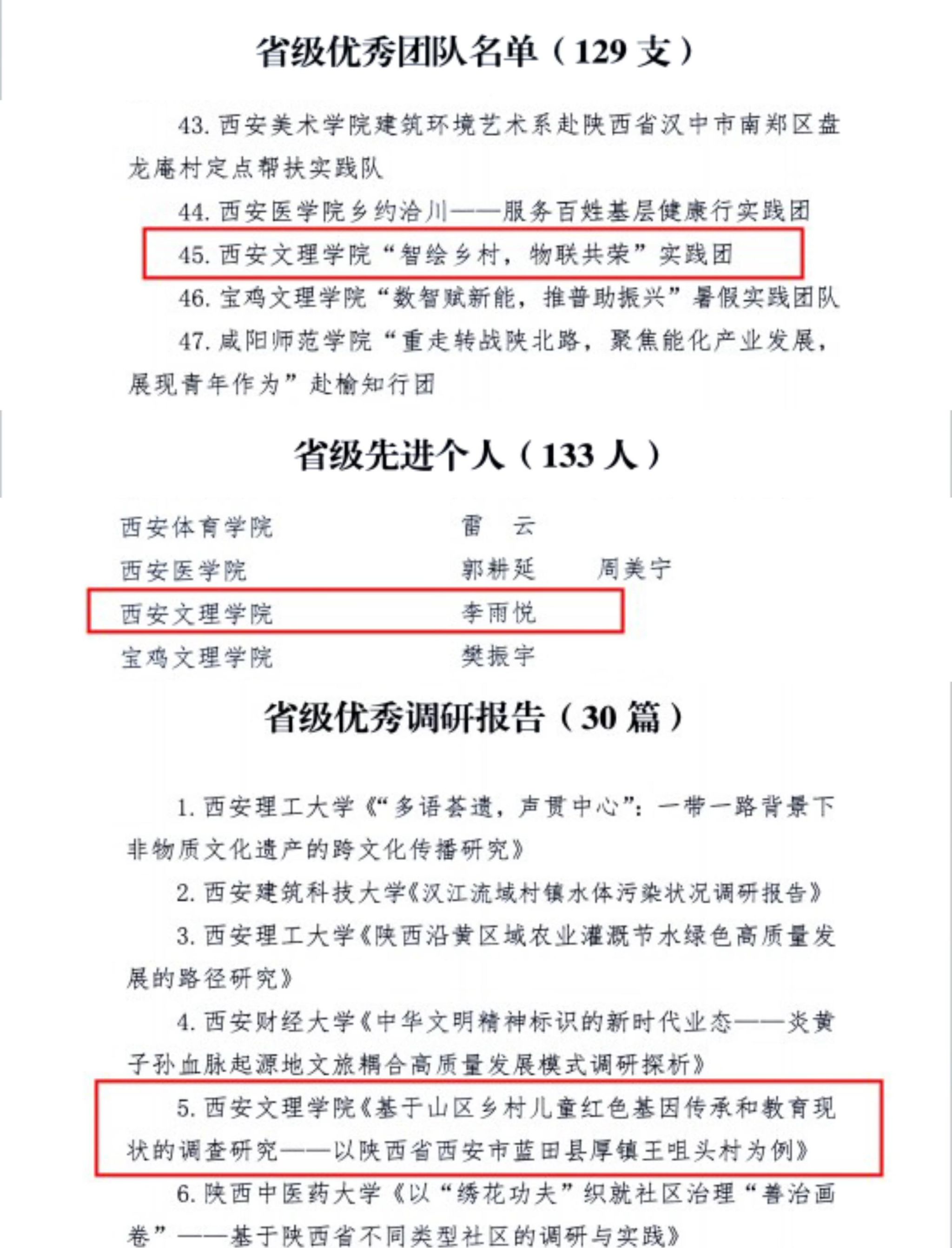 在中共陕西省委宣传部、中共陕西省委教育工委、共青团陕西省委、陕西省学生联合会联合印发文件中通报2024年陕西省大学生暑期文化科技卫生“三下乡”社会实践活动评选结果,我校信息工程学院“智绘乡村、物联共荣”实践团荣获2024年暑期“三下乡”活动省级优秀团队、文学院学生李雨悦获省级先进个人、信息工程学院《基于山区乡村儿童红色基因传承和教育现状的调研研究——以陕西省西安市蓝田县厚镇王咀头村为例》获省级优秀调研报告。今年我校社会实践活动成果斐然,尤其在调研报告方面,填补了历史空白,充分彰显我校学子在实践探索与学术研究领域的卓越风采和深厚潜力。