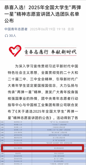 近日,团中央公布了2025年全国大学生“两弹一星”精神志愿宣讲团的入选名单,机械与材料工程学院大学生青言青语宣讲团成功入选,这是近三年来学院连续第四支入选团中央志愿服务项目的学生组织,充分激发“新工科”学生投身科技强国事业的热情。