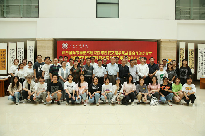 6月29日下午,陕西国际书画艺术研究院与我校战略合作签约仪式暨书法学系教学汇报展在明德楼举行。 校长陈刚,党委委员、组织部长袁卫敏,服务地方办公室主任田建邦,师范学院院长曹莹、党总支书记武军安、书画艺术中...