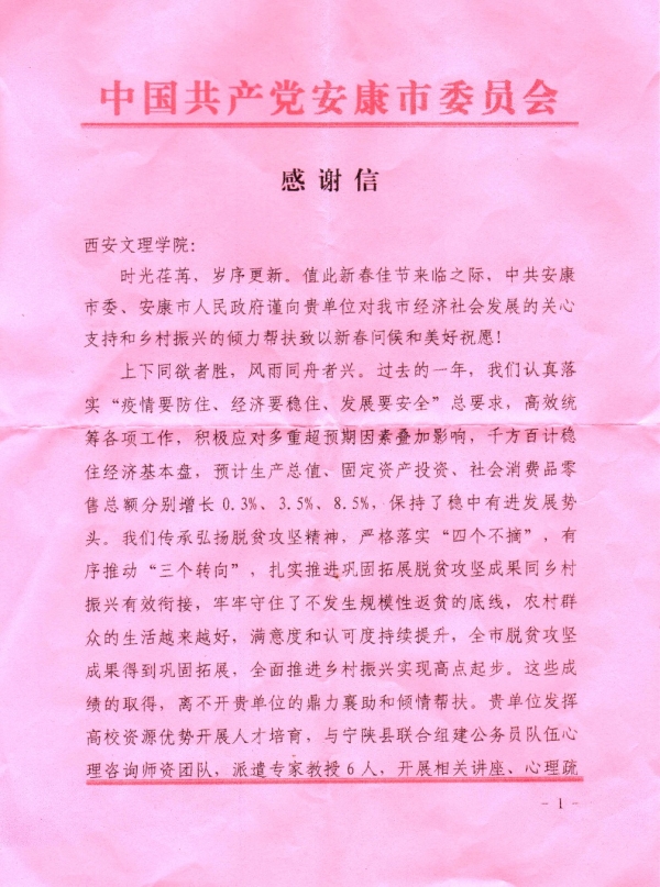 近日,中共安康市委、安康市人民政府向我校发来感谢信,感谢学校对安康市经济社会发展的关心支持和乡村振兴的倾力帮扶,并向我校致以新春问候,希望我校一如既往地关注和支持安康经济社会发展,巩固拓展脱贫攻坚成果...