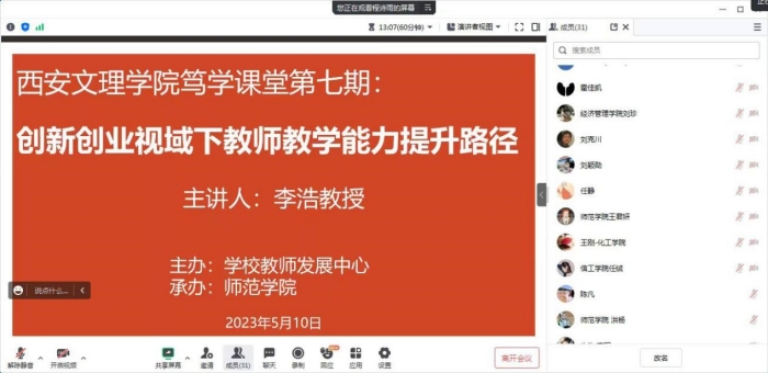 5月10日下午,人事处(教师发展中心)“笃学讲堂”第七期如期举办。此次活动由师范学院承办,主题为“创新创业视域下教师教学能力提升路径”,邀请学校大学生创新创业中心副主任、陕西省高等学校教学指导委员会委员李...