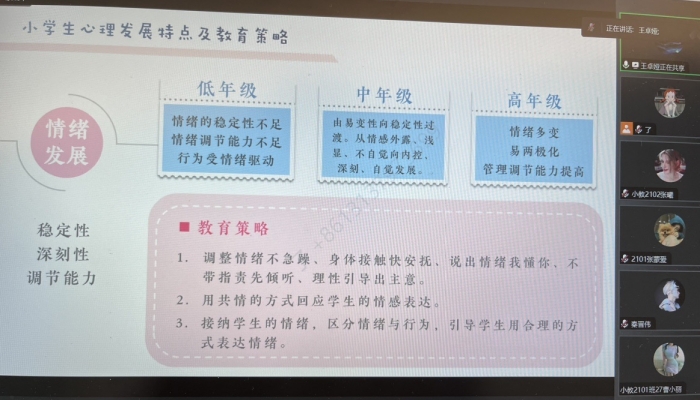 9月5日下午,师范学院于线上举办2023年小学心理健康教育实践讲座第一讲,邀请西安高新区实验小学学生发展指导中心主任,陕西师范大学教育博士,西安高新区教学能手、优秀教师,家庭教育高级指导师王卓娅,以“小学教...