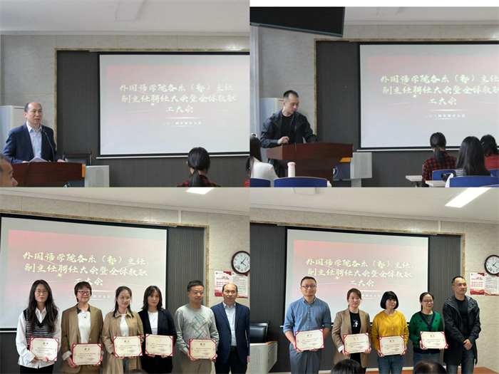 4月9日下午,学院在弘文楼H0129会议室召开了外国语学院各系(部)主任、副主任聘任大会暨工作部署会,院班子成员、全体教职工参加了会议。会议由党总支书记王一主持。 会议分为两个阶段,第一阶段,外国语学院系...
