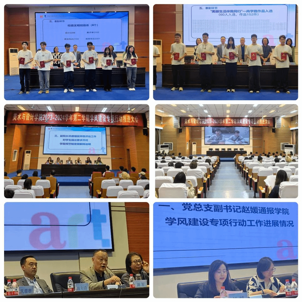 为扎实推进学风建设,营造积极向上的学习氛围,促进学生全面发展,全院学生能以良好的状态迎接审核评估,5月8日,美术与设计学院召开了2023-2024学年第二学期学风建设专项行动推进大会。学院全体班子成员、各系主任、全体辅导员、教学秘书、2023级学生及全体学生干部280余人参会。会议由党总支副书记赵媛主持。大会上,赵媛对学院本学期开展学风建设专项行动工作的进展和成效进行了详细通报和总结,并对下一步学风建设进行了总体安排;...