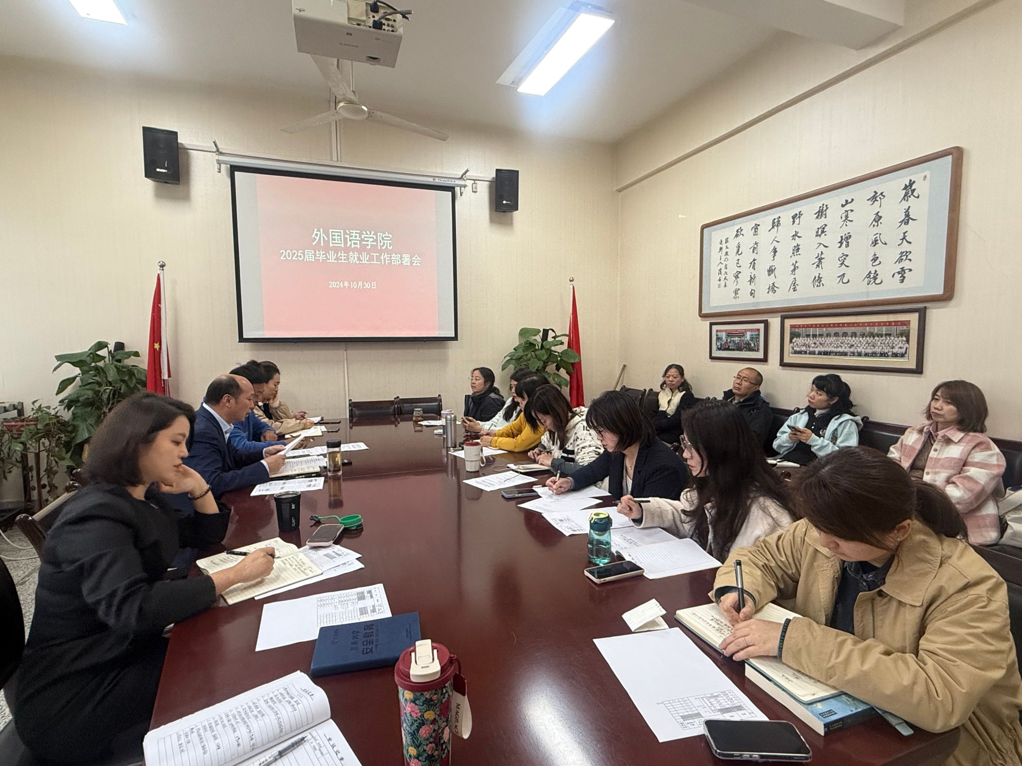 近日,外国语学院召开2025届毕业生就业工作部署会。学院领导班子全体成员,各系主任、副主任、各支部书记、全体辅导员等参加会议。会议由党总支书记王一主持。首先,学工办主任田先利总结2024届毕业生就业工作中的成绩和不足,解读《2024届毕业生就业质量报告》,提出改进措施和当前就业重点工作。其后,王一解读《外国语学院2025届毕业生就业工作方案》,明确工作总体思路和目标:早,动、稳,即早行动,全院教职工即刻开始开展2025届毕业生就业指导、...